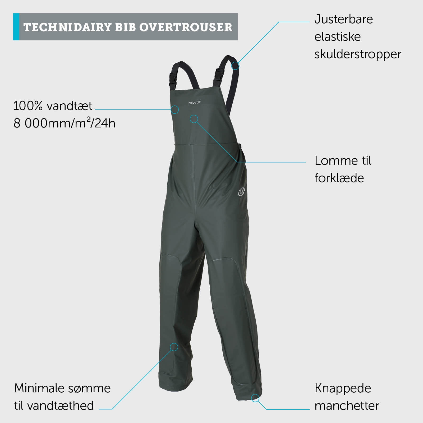 Betacraft Technidairy Overtrækbuks er fuldstændig vandtæt og er fremstillet med tapede sømme for at opnå maksimal beskyttelse. Materialet er designet til at modstå syrer og rengøringsmidler, der anvendes i rengøring af stalde. Denne serie er 100% vandtæt og og har overlegen fleksibilitet og stræk, så komforten er i top.