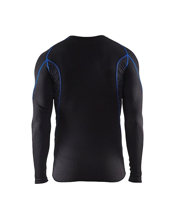 Det ribstrikkede stof øger isoleringen ved at skabe et luftrum mellem kroppen og tøjet, Kan anvendes på alle årstider. Stof med høj fugtgennemstrømning, anbefalet temperatur +10°C to -10°C DETALJER: Rund hals Elastik i linning Syninger i kontrastfarve Paneler med Blåkläder helprint Forlænget ryg Bukket kant i benafslutning Bukket kant i ærmeafslutning 100% polyester, ribstrikket, fugttransporterende, 170 g/m² LIGHT, fugttransporterende, kanalstrikkel for at holde varmen. Produktet er lavet af Oeko-Tex® 100-certificeret materiale.