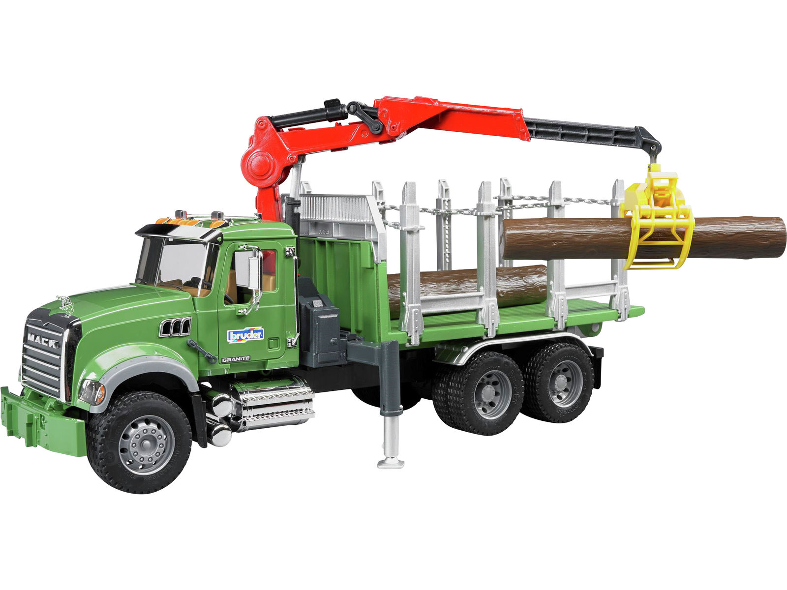 Bruder 02824 MACK Granite lastbil med kran og tre lange træstammer
