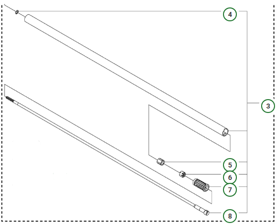 Komplet rør inklusiv drivaksel, prop, klemme, støtteleje og låseskive.