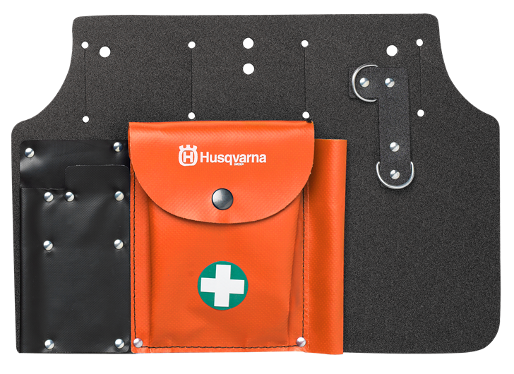 Med stor opbevaringslomme, med holder til førstehjælpssæt, reservekæde og karburatorskruetrækker. Holder til fil, filmål og kombinøgle.