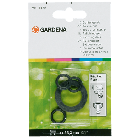 Gardena pakningssæt, pakke med 1 pakning og 3 O-ringe.