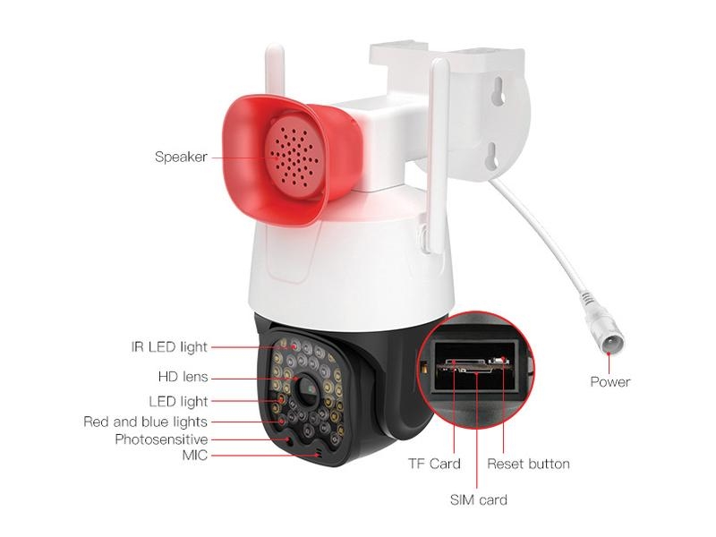 Kameraet er udstyret med røde og blå blinkende advarselslamper samt en imponerende sirene på 130 dB, der kan afskrække eventuelle ubudne gæster.
