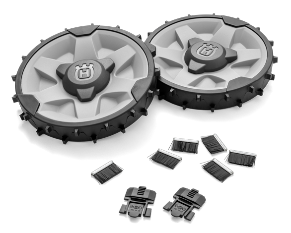 Hjulsæt til ujævnt terræn som indeholder grovprofilhjul og hjulbørster, for fantastisk kørsel på ujævne og skrånende græsplæner.