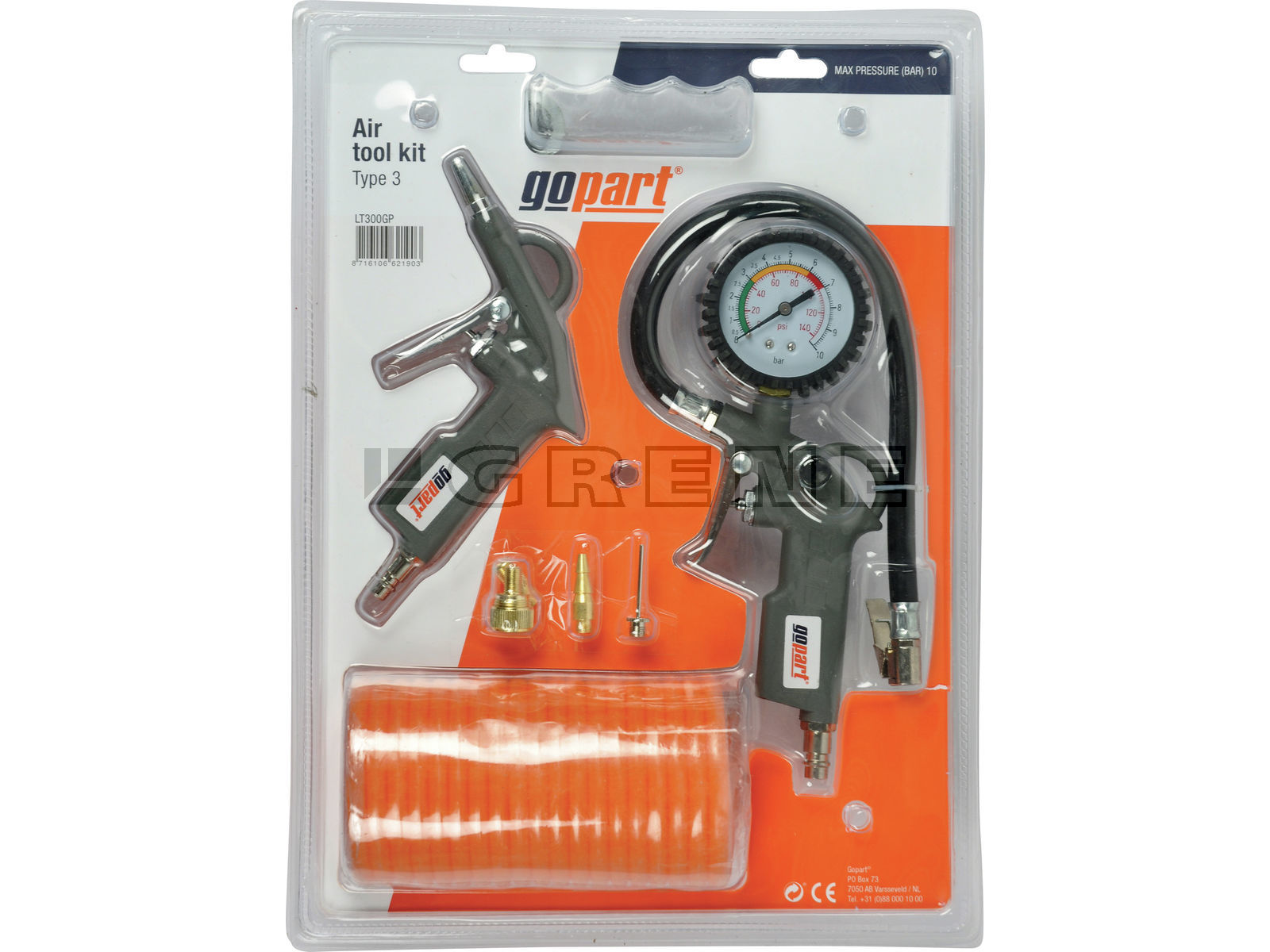 Luftkit med blæsepistol, luftpåfylder, spiralslange og tilbehør
